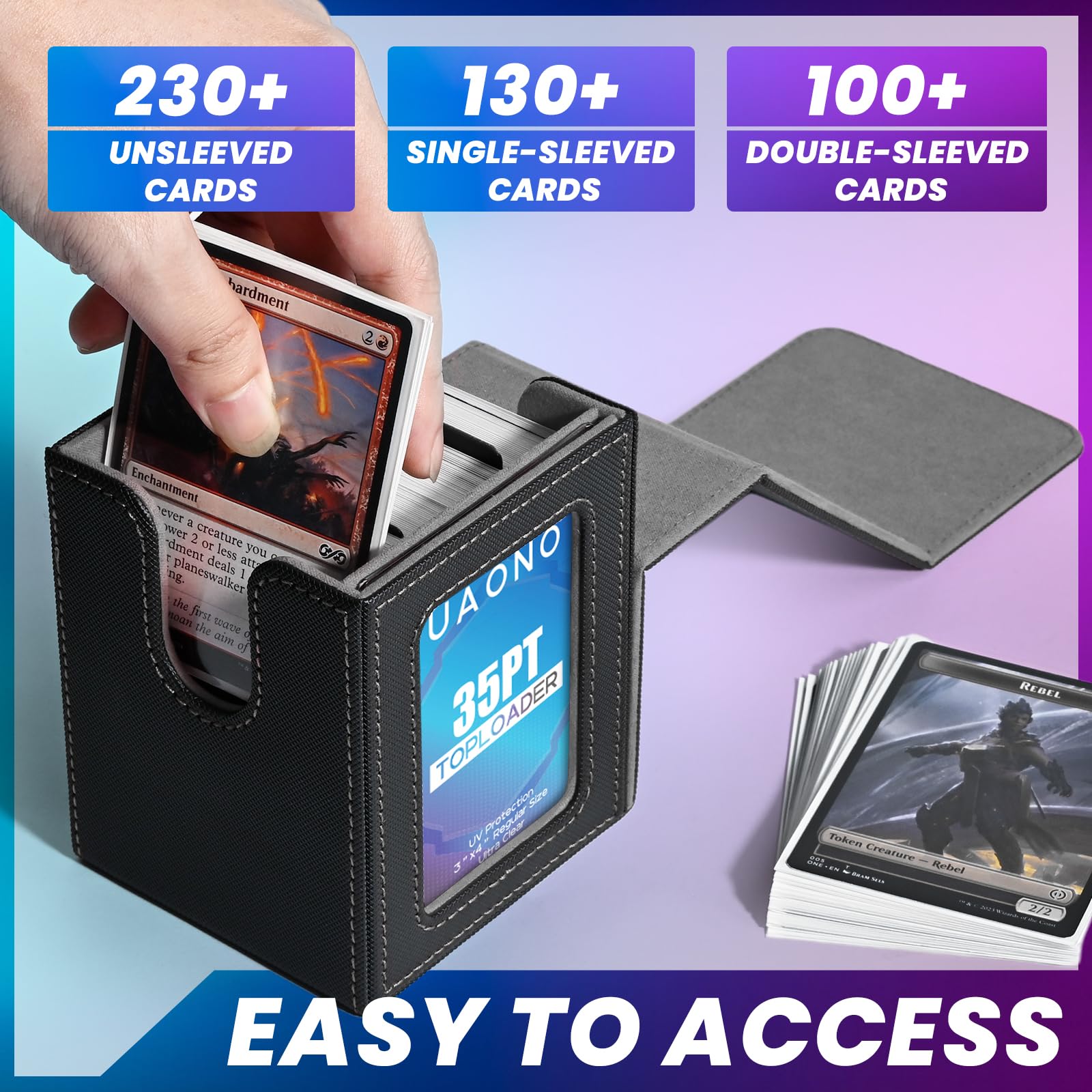 UAONO Card Deck Box with MTG Commander Display, Deck Case Holds 100+ Double-Sleeved Cards, Trading Card Storage Box Fits TCG/PTCG/Sports Card with 2 Dividers, 1 Top Loaders (Black)